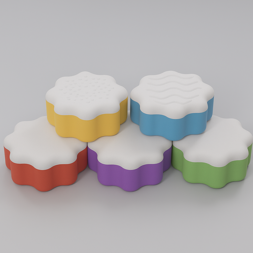 Each SENspark unit can light up, vibrate, and play sound in response to touch, movement, or special RFID activity cards. Its silicone casing is ergonomically designed for children with varying motor abilities. In group settings, multiple SENspark units connect wirelessly, enabling collaborative structured activities — a unique feature not found in any other product in the family.